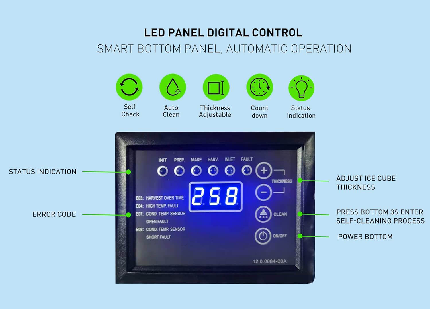 - One lot ice-making time 15-18 minutes, insulated icebox storage ices 24 hours if power failure.